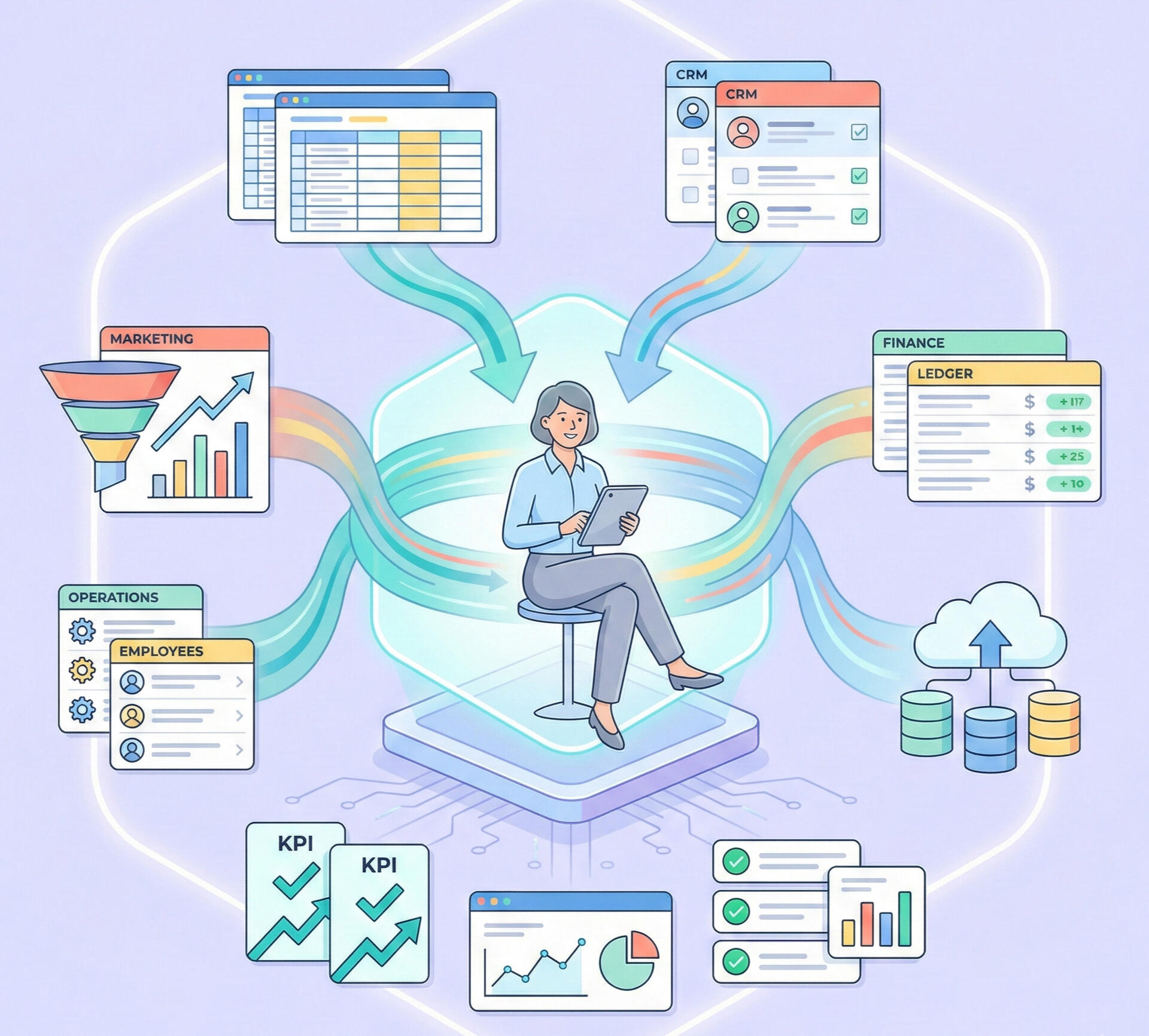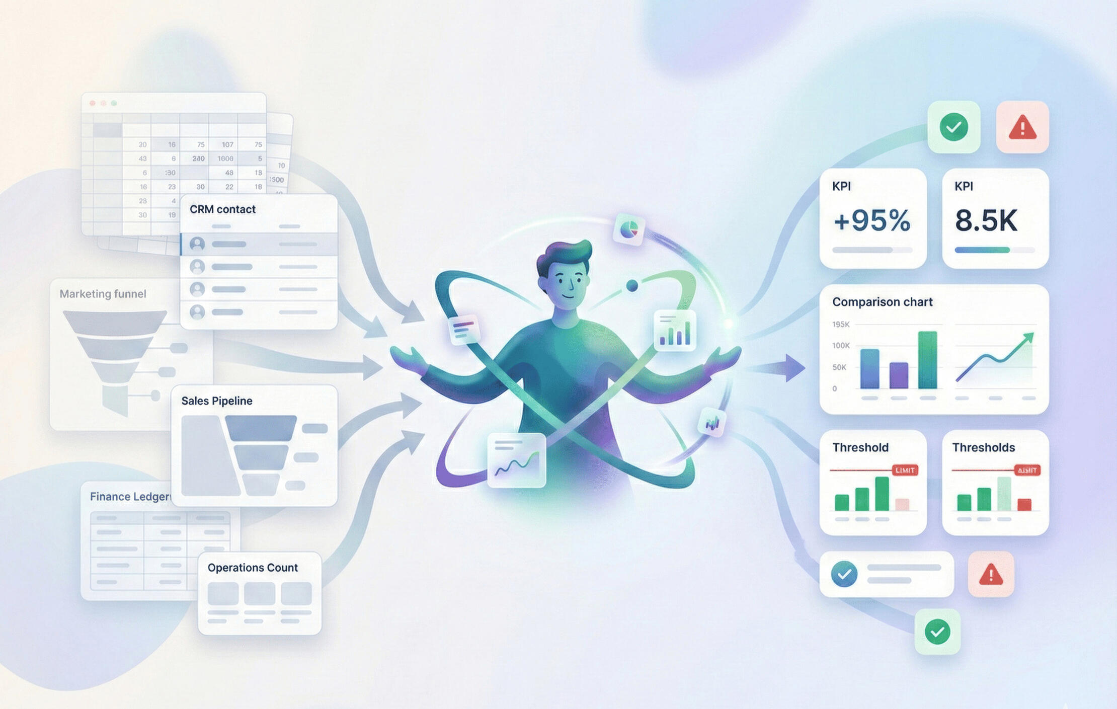 We pull the data hidden in your different tools, apps, systems, and messy spreadsheets into one clear home. No more hunting for numbers—just clean, connected info ready to help you make your next big move.